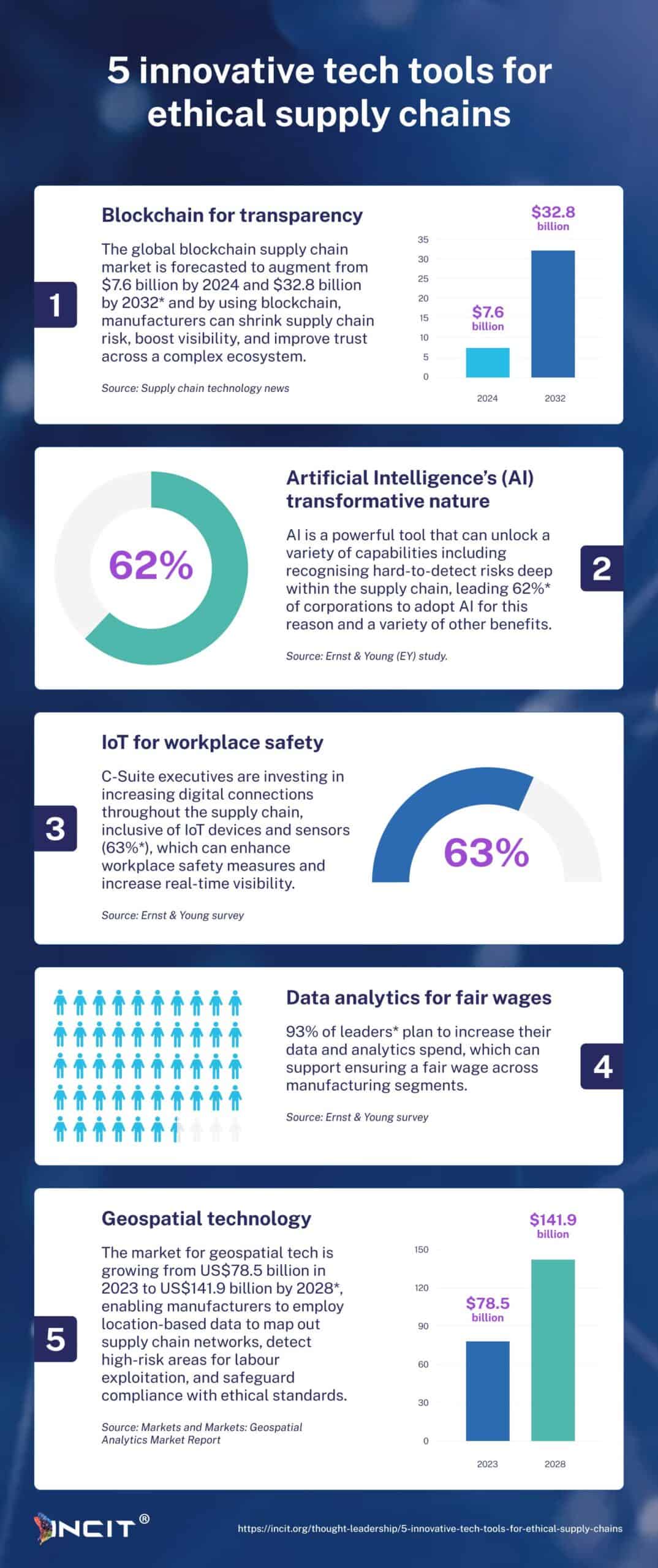उद्योग 4.0 द्वारा शुरू की गई उभरती हुई प्रौद्योगिकियाँ नेताओं को वास्तविक समय की दृश्यता और आपूर्ति श्रृंखला पारदर्शिता प्राप्त करने के लिए नवीनतम प्रगति का लाभ उठाने का अवसर प्रदान करती हैं। ये प्रौद्योगिकियाँ कम वेतन, जबरन श्रम और कार्यस्थल सुरक्षा मुद्दों जैसी विसंगतियों और जोखिमों का पता लगा सकती हैं। आपूर्ति श्रृंखलाओं के भीतर नैतिक नीतियों के एकीकरण को नेविगेट करने के लिए, नेता निम्नलिखित अभिनव उपकरणों की शक्ति का उपयोग कर सकते हैं।