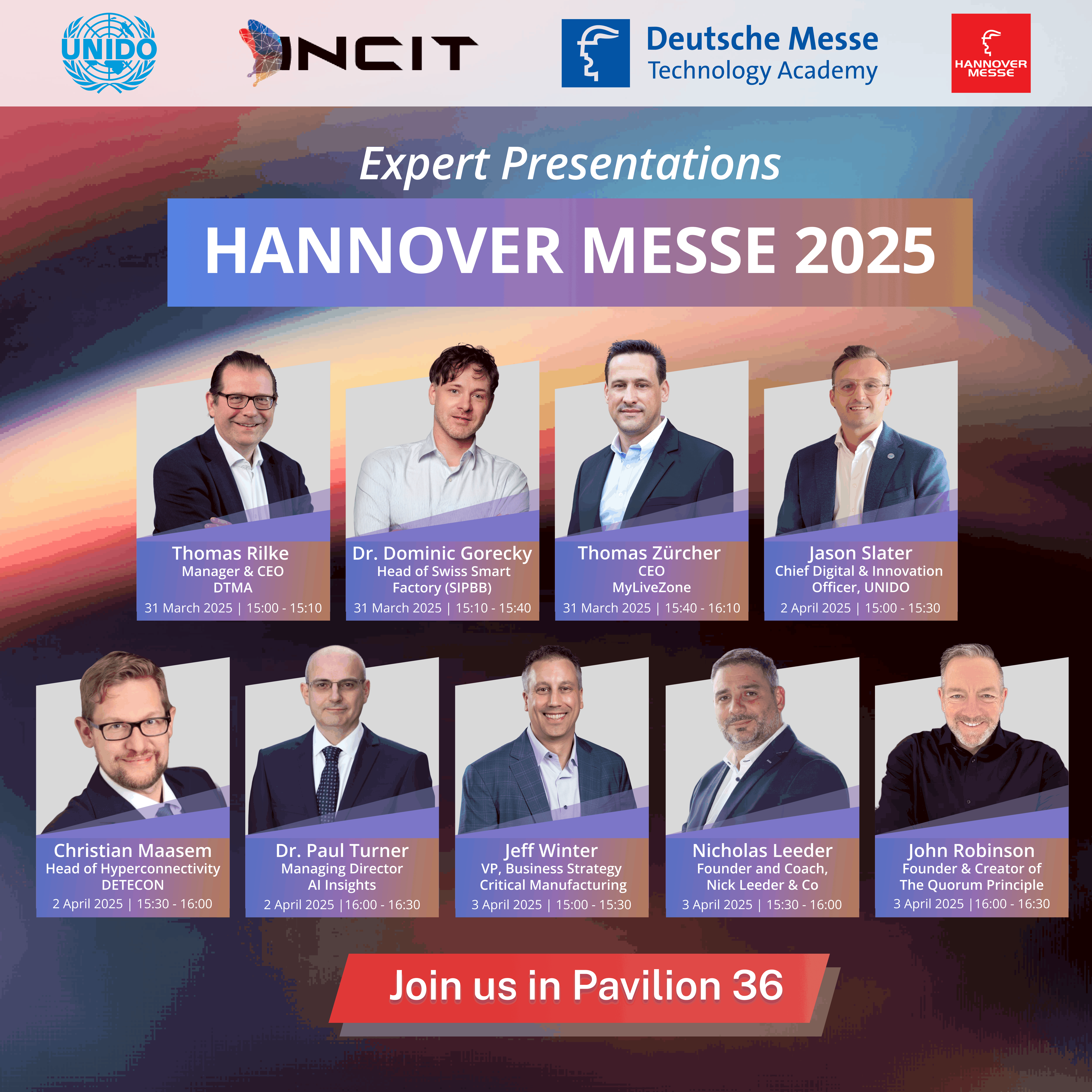 Berlaku semasa Hannover Messe di Akademi Kilang Pintar di Pavilion 36, setiap hari dikhususkan untuk tema pembuatan tertentu, menawarkan pandangan mendalam daripada pakar industri terkemuka. Format ini memastikan bahawa setiap sesi disasarkan, menarik dan memberi kesan kepada semua peserta.