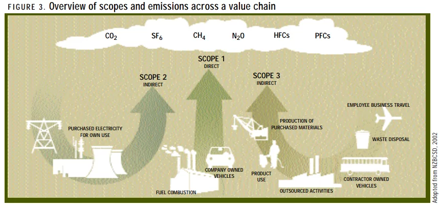 - Skop 3: meliputi pelepasan GHG tidak langsung yang disebabkan oleh aktiviti huluan atau hiliran dalam rantaian nilai syarikat yang lebih luas, seperti pengekstrakan bahan mentah (hulu) atau pelupusan sisa (hiliran). Skop 1 dan pelepasan 2 syarikat adalah Skop 3 syarikat lain.