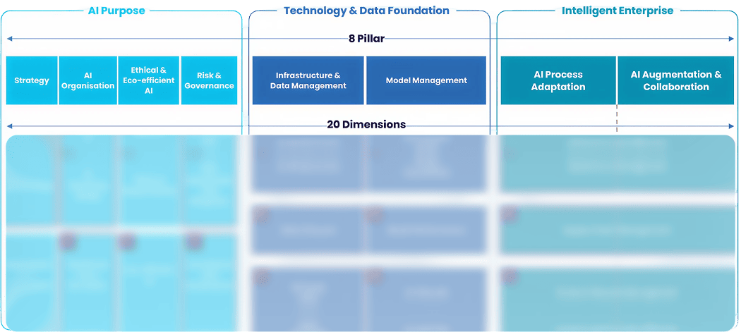 AIMRI evaluates AI maturity across three core building blocks and eight strategic pillars, providing a structured roadmap for AI adoption and scaling.
